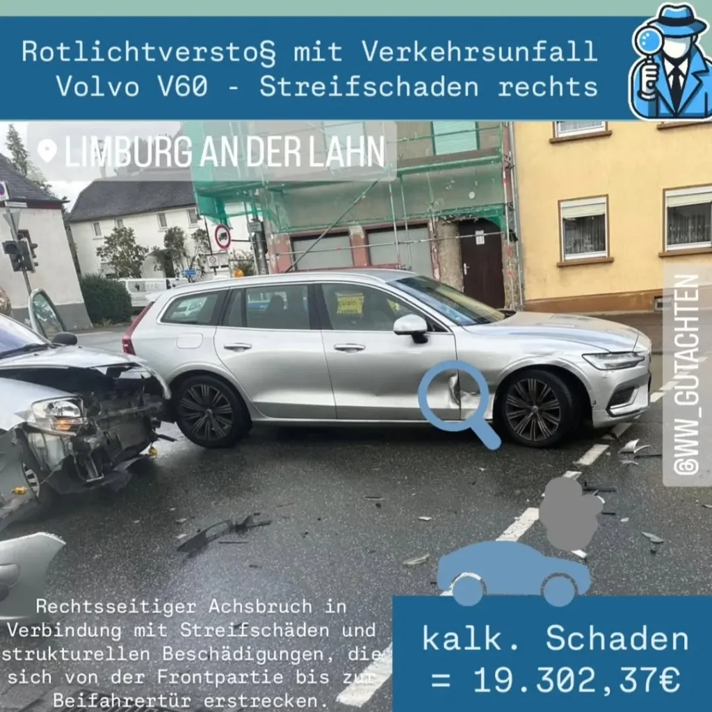 Ein Verkehrsunfall infolge eines Rotlichtverstoßes führte zu erheblichen Schäden am Fahrzeug. Wir haben die Besichtigung des Beschädigten Fahzeugs in Limburg übernommen und dabei einen Sachschaden von 19.302,37 € kalkuliert