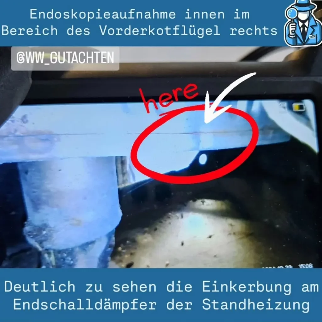 Dank unseres modernen Equipments konnten wir mithilfe einer Endoskopie sogar verdeckte Schäden ausfindig machen. Dabei war die deutliche Einkerbung am Endschalldämpfer der Standheizung hinter dem rechten Vorderkotflügel klar erkennbar
